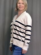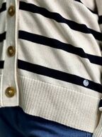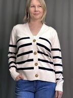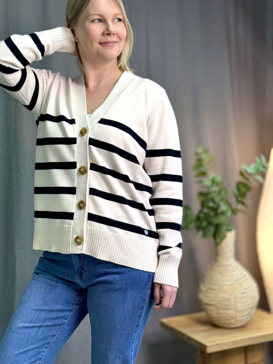 Naisten puuvillainen, luonnonvalkoinen neuletakki tummansinisillä raidoilla on ihanan rento ja raikas. Klassisessa merihenkisessä neuletakissa on ihanan suuret, vaaleanruskeat napit ja V-pääntie. Hihansuissa ja helmassa on joustoneuleresorit, jotka antavat neuleeseen käyttömukavuutta. Puuvillainen neule hengittää, mutta on silti lämmin. Saat söpön asukokonaisuuden yhdistämällä neuletakin rentojen farkkujen kanssa!