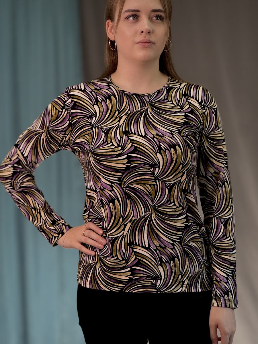 Mustapohjainen pitkähihainen trikoopaita naisille, jossa on vihreää, violettia ja vaaleaa kuviontia. Monikäyttöinen peruspaita naisille jokapäiväiseen käyttöön!