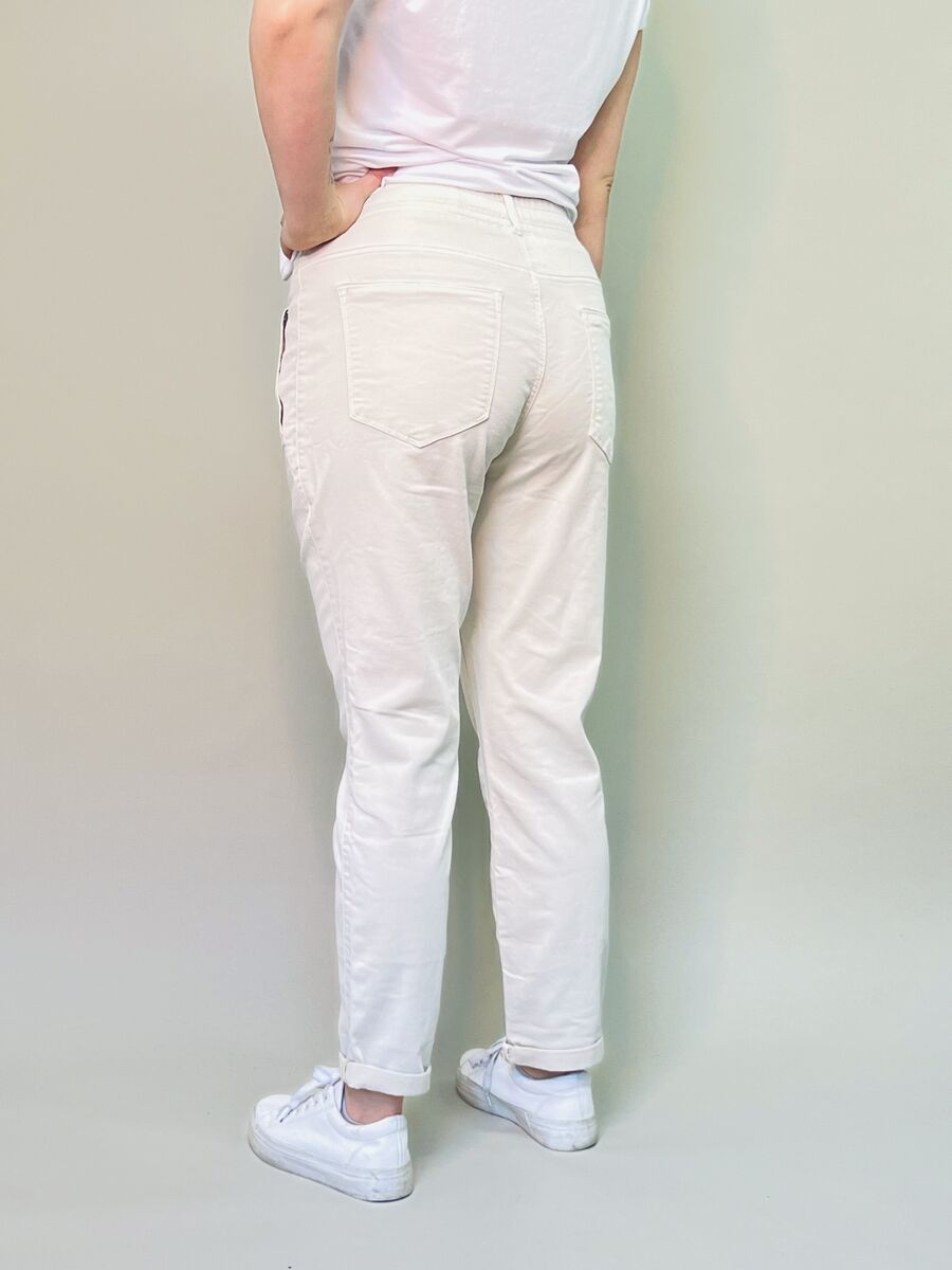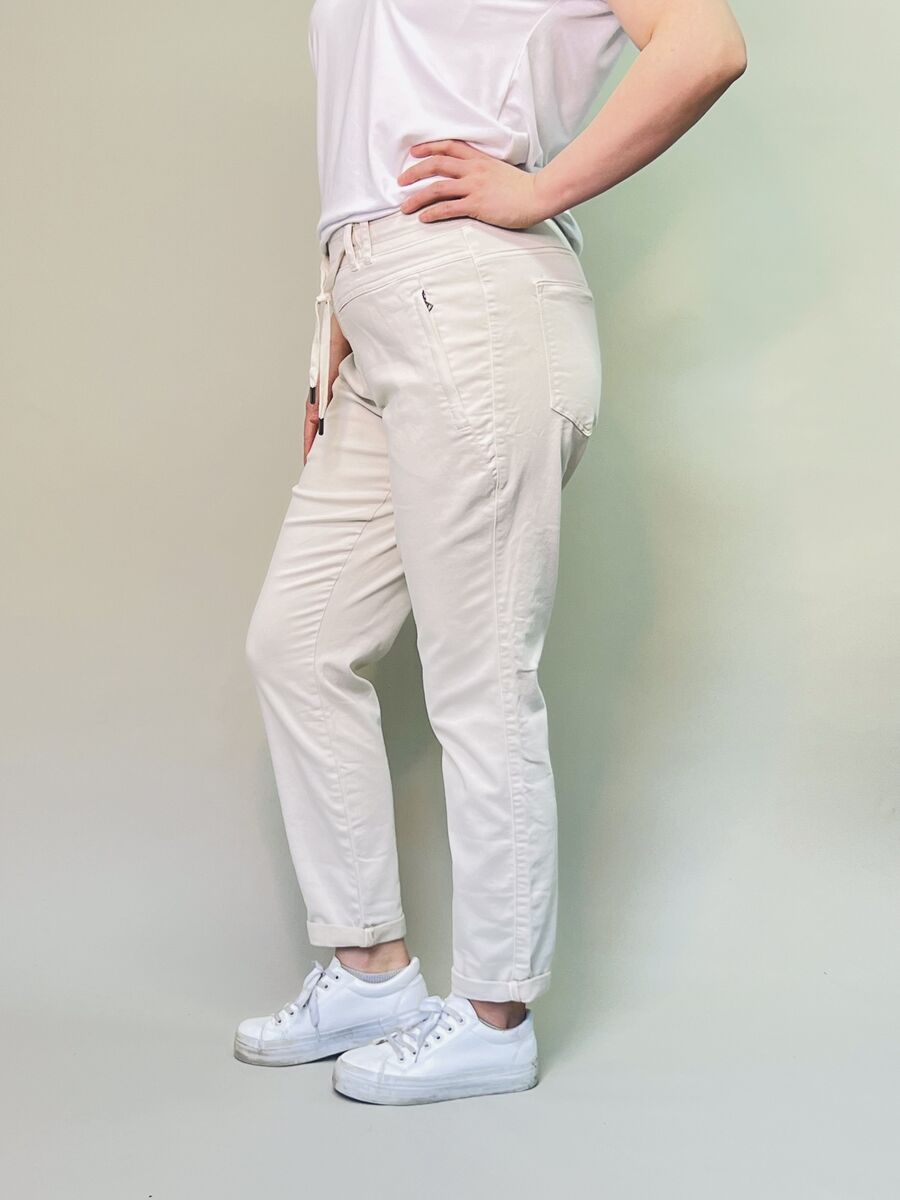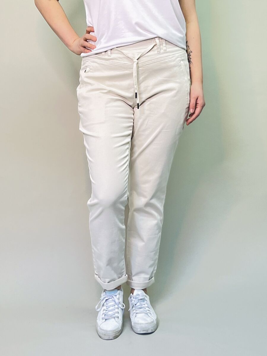 Red Buttonin naisten housut lumoavat käyttäjänsä mukavuudellaan! Joustava vyötärö sekä pehmeä ja miellyttävä materiaali. Nämä jokapäiväiset suosikkihousut sopivat ihanteellisesti vaikkapa toimistokäyttöön, sillä niissä on upea istuvuus ja tyylikäs vaalea väri. Housujen valmistuksessa hyödynnetty Repreve-kuitu on peräisin kierrätetyistä muovipulloista.